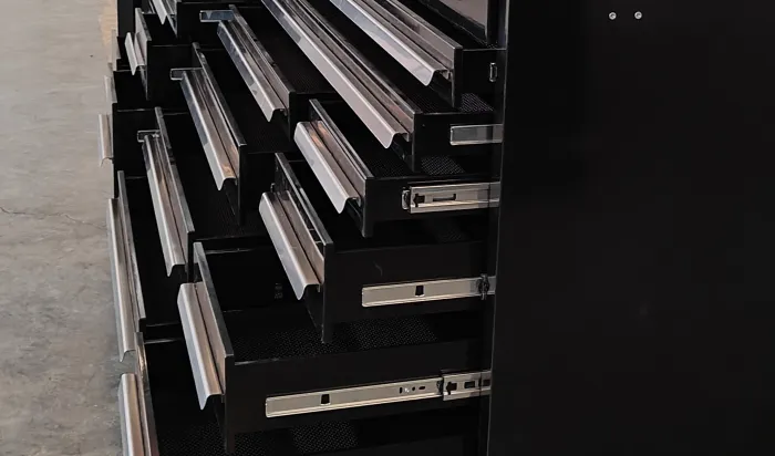 Sessiz Slayt Rayları: Siyah çok fonksiyonlu alet dolabı, yumuşak çekme hareketi ve güçlü yük taşıma kapasitesine sahip ağır hizmet tipi sessiz slayt raylarına sahiptir.