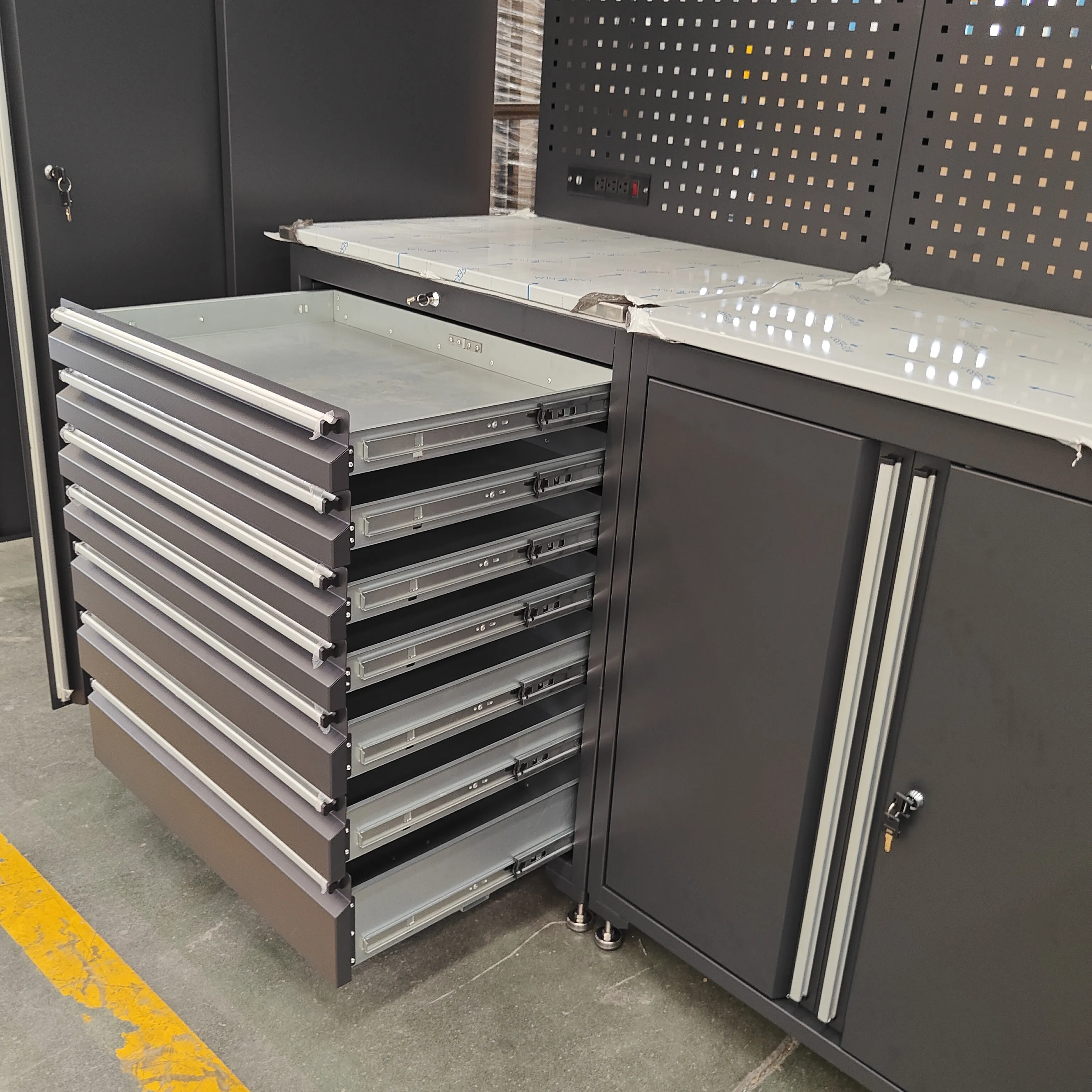 Ağır hizmet alet dolabında, her çekmecede açık raf tasarımına sahip, farklı boyutlu araçlar için uygun çoklu çekmeceler bulunur.
