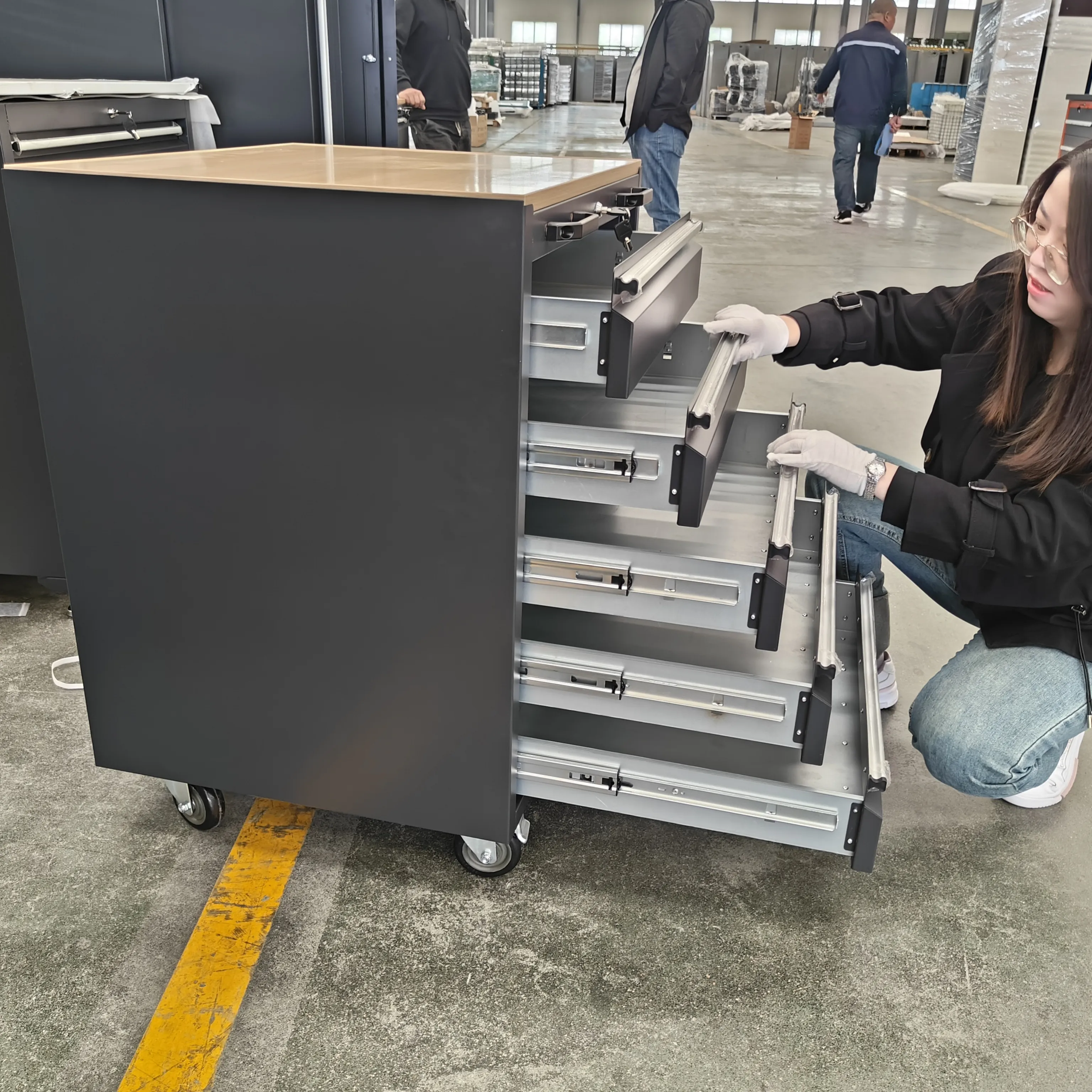 Ağır hizmet alet dolabının çekmeceleri, çekmeceleri açarken veya kapatırken gürültü sağlamayan sessiz sürgülü raylarla donatılmıştır.
