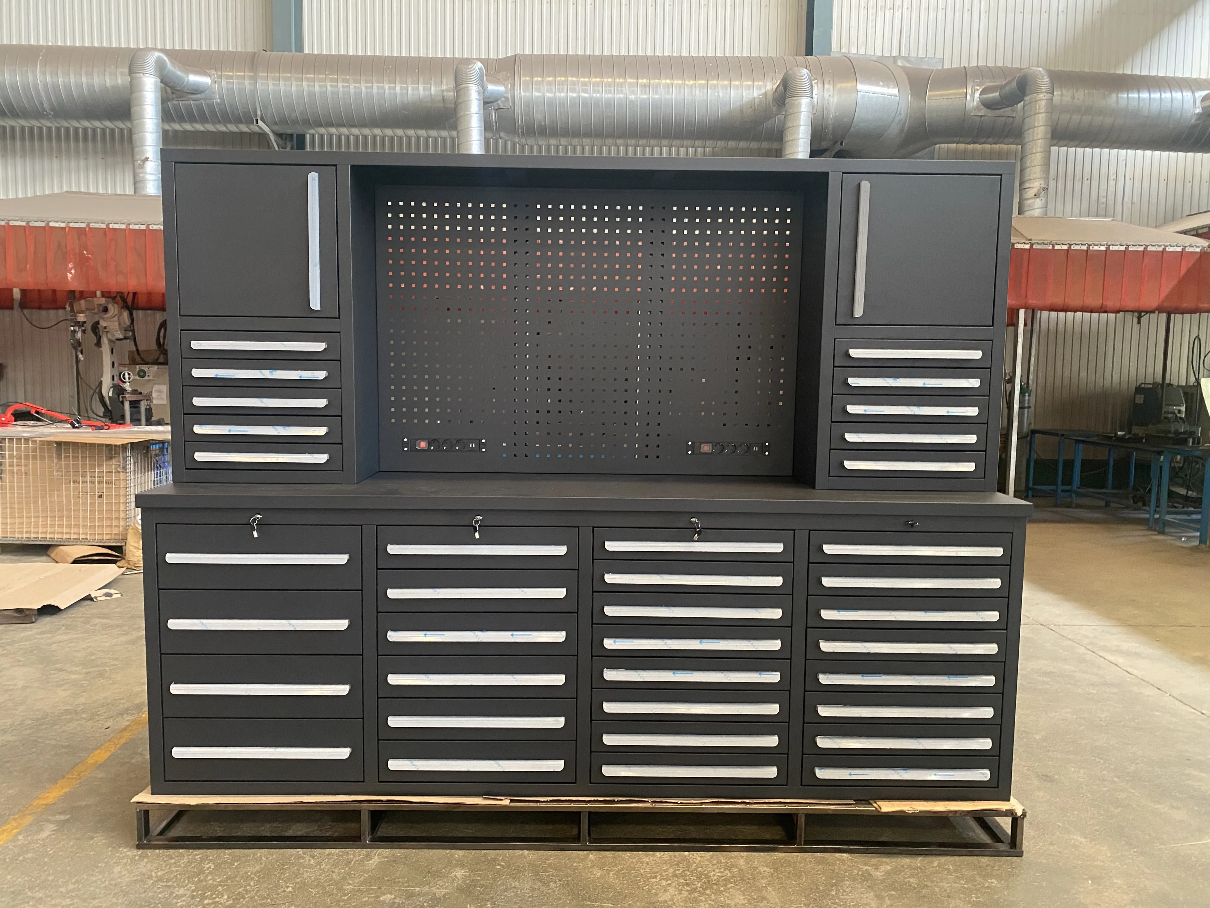 Takım dolabı 2550 milimetre uzunluğundadır. Kalınlık, renk, boyut ve çekmeceler müşterilerin gereksinimlerine göre özelleştirilebilir. Hem Wrokbench hem de Çekmeceler soğuk yuvarlanan çelikten yapılmıştır. Burada iki güç şeridi var. Çekmeceler LED ışıklarla donatılmıştır, LED ışıkları, çalışma tezgahında çalışırken aydınlatmayı kolaylaştıran örgü paneline asılabilir. Çekmecelerde çizikleri etkili bir şekilde azaltabilen yastıklar var.