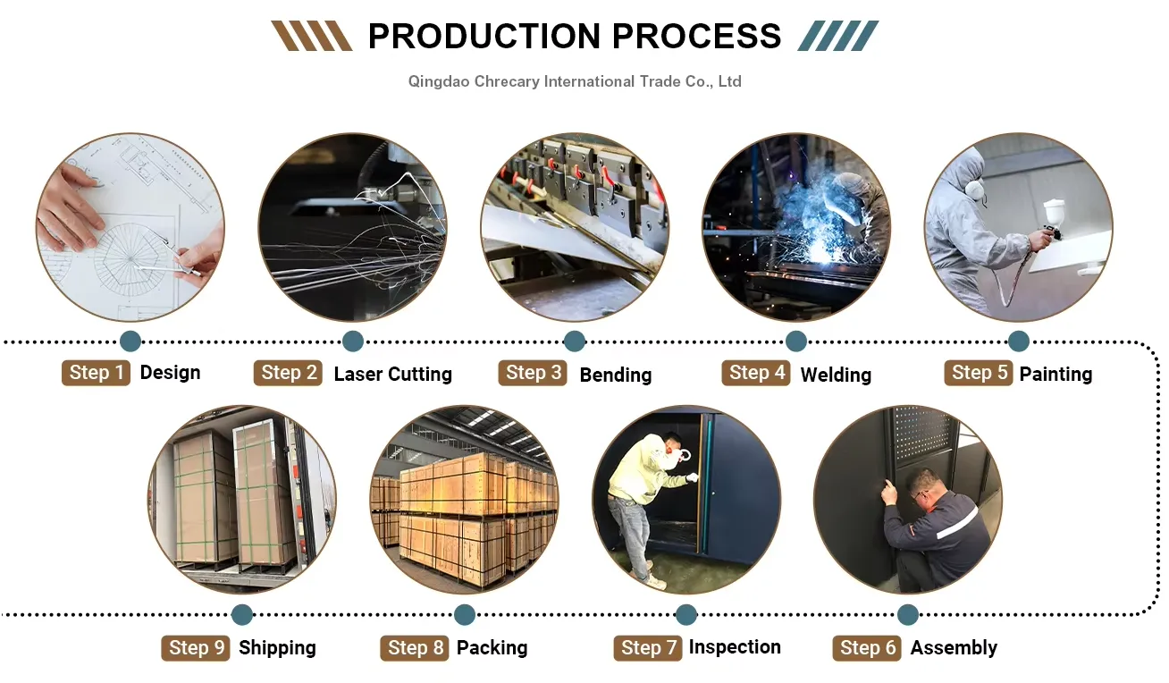 1. Hammadde Tedarik: Yüksek kaliteli soğuk haddelenmiş çelik plakalar, malzeme mukavemeti ve tokluğunun yüksek standartları karşılamasını sağlamak için ana malzeme olarak dikkatle seçilir. Aynı zamanda, çekmeceler, kilitler ve tekerlekler için bilyalı taşıma slaytları gibi çeşitli yüksek kaliteli yardımcı malzemeler satın alınır.